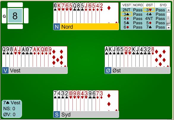 Tommy i Syd som nå har en makshand (14 hfp) valgte nå å melde denne som en minimumshand og meldte 3 spar . Etter systemet kunne han ha meldt 3 ruter, som viser tillegg og interesse for 4 spar med maks hos makker, men siden det ikke blir gjort har makker en obligatorisk pass. Denne gangen ble det skjebnesvangert. Videre meldingsforløp gikk dermed pass, pass og 4 kløver hos Gunnar Ødegård. 4 spar fra Tommy var selvfølgelig for sent nå, og Torbjørn Amdam hadde ingen problemer med å melde stampen 5 kløver.