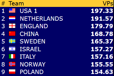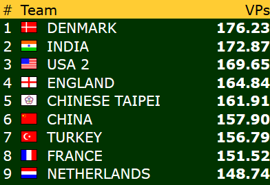 Det ble ei beit i 3 spar, men 100 er jo billig i forhold til 500. Dermed 9 IMP ut for Norge.