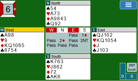 I lukket rom åpnet Ulf med 1 ruter, presisjon (11-15 hp, minst 1 ruter). 2 ruter fra Nils viste 10+ med minst 4-kortsfarge. I 2 grand var stikkpotensialet dårlig da syd ikke hadde rutertilpasning, og farga attpåtil satt surt. Tre beit og 150 ut.