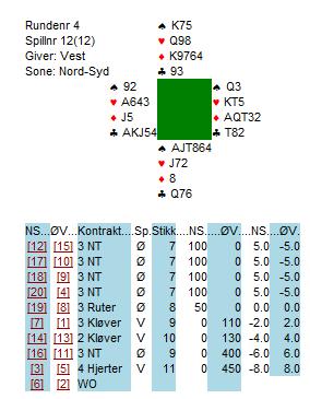 I juleturneringen (par) var spill nummer 12 et interessant tilfellet. Tommy Skodje og Petter Haram satt øst/vest , mot Gunnar Fylling og Harald Trengereid nord/syd og kortene var;