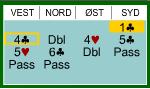 Igjen reiser spørsmålet seg om du og makker har avtalene på plass. Denne gangen har du meldt og makker har støttet og makker har doblet slem. Meldingsforløpet har gått som i diagrammet under, der du er vest: