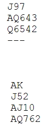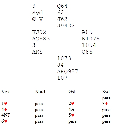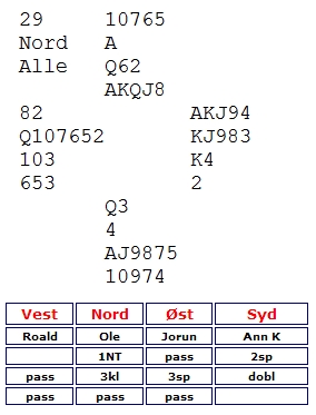 Team Bente Skymoen tapte knapt mot Drøbak. Bente og Tom hadde en fin liste, men litt harde meldinger fra det andre paret medførte et knapt tap. Her var de en håpløs 7 ruter, og en enda mer håpløs 6 NT. Dette er dyrt.
