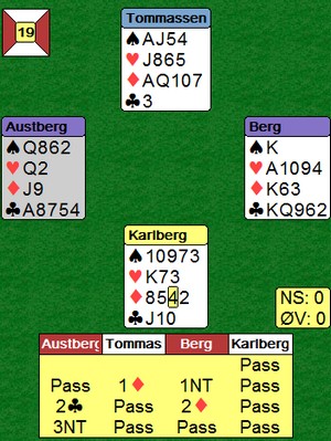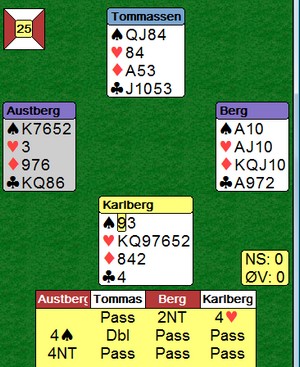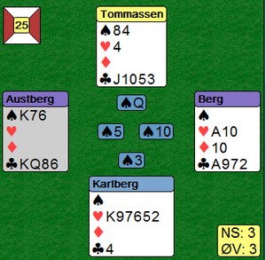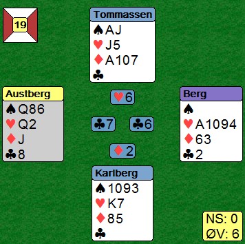 John Ivar vant igjen i kveld, nå med ny makker. Kanskje vi må gi ham dobbelt handicap neste år? Ellers ble Kjell suveren vinner av handicapturneringa. Videre rekkefølge: John Ivar, Hallgeir, Ingeborg og Tron, Magne og Alf, Knut og Jan Erik, Jane og Tor, Gunborg og Leif Kristian, Halvard og Mari Anne. Bare de som har spilt minst 3 kvelder er tatt med.