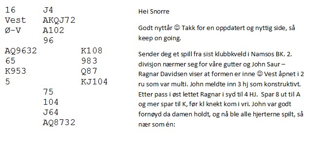 Årets aller første spill var interessant. Ved vårt bord åpnet Nord med 1 ruter, Syd meldte 1 spar, Vest 2 kløver og Nord viste tre spar ved å doble (støttedobling). Syd meldte 3 kløver, men Nord hadde ikke kløverhold og meldte 3 hjerter. Syd regnet da med at Nord var kort i kløver og tok sjansen på 4 spar.