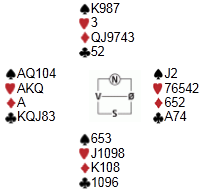 Det var mange morsomme spill denne kvelden, med gode spille- og meldepoenger. En hånd som voldte problemer for samtlige vest-spillere i lokalet var følgende: