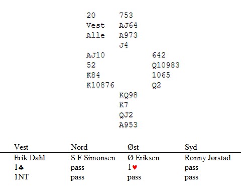 Ruter ut til knekt og konge.Kløver til damen som stod (!) og ny kløver til 10 og min knekt. Smithsignalene var i orden, så vi cashet ruteren før jeg spilte spar fra nord til dame og ess. Mer spar fra spillefører til Jørstad sin konge. Han fortsatte med en liten hjerter til mitt ess og jeg spilte enda en hjerter til Ronny sin konge før han puttet Dahl inn i spar . Vi fikk de to siste når spillefører måtte avslutte med kløver fra K8 til E9.