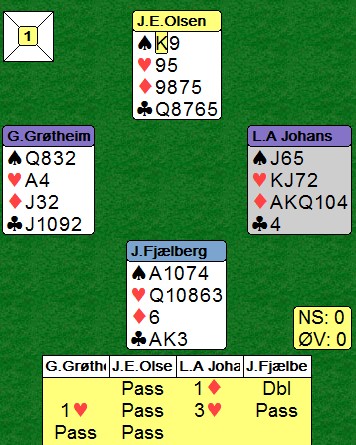 Her synes jeg Glenn Grøtheim virkelig grov dypt i meldeboksen, men han likte kortene sine selv om de innholdt bare 10 honnørpoeng. Å doble for å vise hjerter, var ikke aktuelt. Skulle han spille utgang, virka det som 3NT var nærmest.