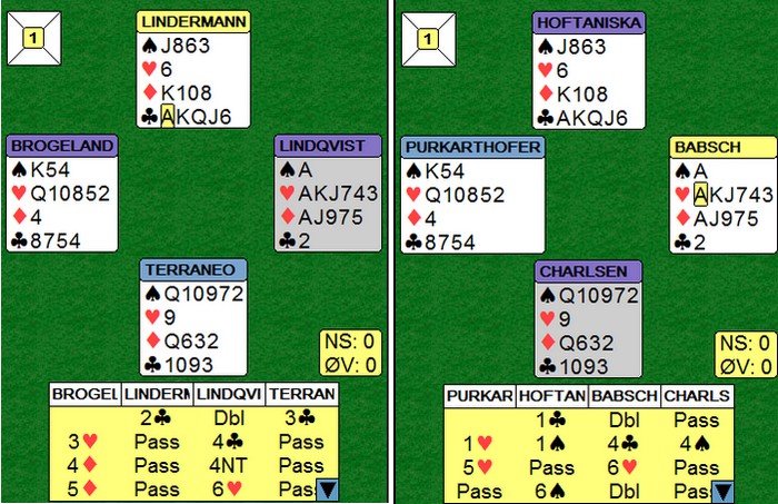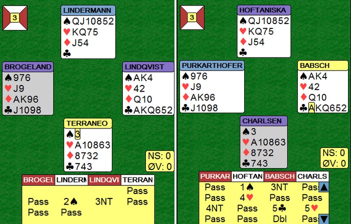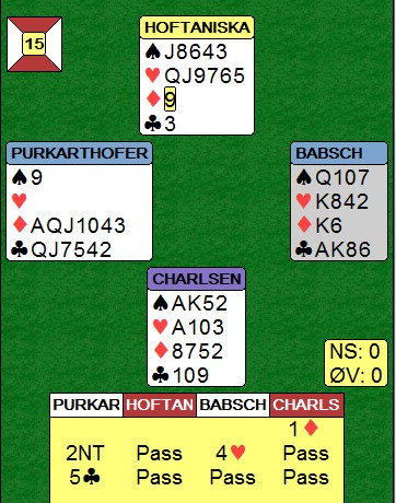 Østerrikeren i Øst trodde 2NT viste de to laveste umeldte fargene og hoppet til 4 hjerter over 2NT. Nå hadde dessverre Vest så mye minor at det ikke var aktuelt og stå med og de kom i en spillbar kontrakt. Husk at det brukes skjermer, så makker får ikke med seg alerteringer og forklaringer. Med feks 2155 ville Vest passet på 4 hjerter. Hoftaniska og Charlsen ropte på turneringsleder etter spillet, men uten at jeg kan se at de på noen måte kan få medhold i noe. Østerrikerne brant jo slemmen!