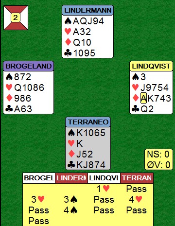 * Og der viser det seg at noe ureglementert har skjedd. Spillet er justert til 4 hjerter minus seks for Østerrike og Norge får 12 imp til! |