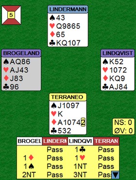 I spill 12 melde østerrikerne altfor hardt og havnet i en steindød 6 hjerter. Boye og Espen tok det litt mer med ro, men klarte ikke å stoppe før i 5 hjerter. Men selv der var det problemer. Med spar ut ville kontrakten vært sjanseløs, men med trumf ut fikk Boye sjansen: