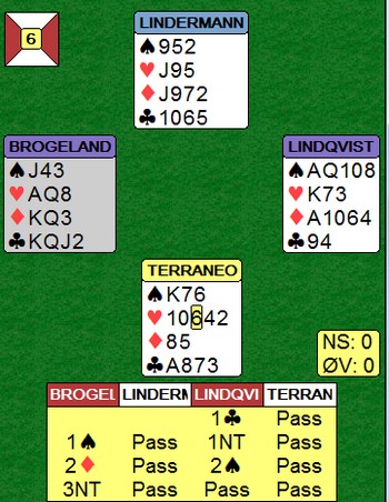 Når Boye valgte ruter 6 i andre stikk frem for ruter 8 betyr det at han har noe i kløver. Espen ser at dette bare kan være esset og spiller flott en liten kløver fra damen! Spillefører har nå fått et avkast på ruterknekt til en kløver, så han må bare gjette hvem som har kløveress og hvem som har kløverdame. Et så pent motspill fortjener selvfølgelig at han bommer. Etter en liten tenkepause valgte spillefører kongen og 12 imp til Norge da Hoftaniska valgte rett i kløver på det andre bordet.