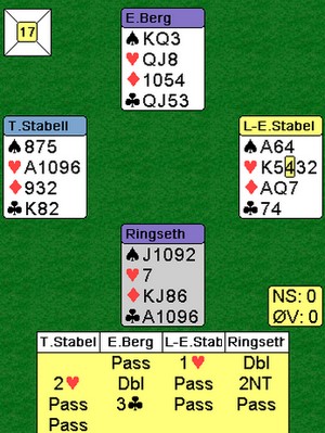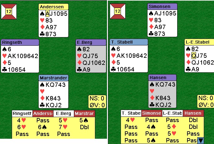 "Vi har det også bra. Nå venter vi på par, men er ikke helt sikker på reglene. Det er sikkert oversiktlig nok, men vi har bare ikke satt oss helt inn i det. Det viktigste er å ta mange stikk i gode kontrakter. Da går det helt sikkert bra. Flott også at NM Veteran gikk over tre fulle sesjoner. Vi likte ikke helt at NM Veteran og Åpent NM lag gikk samtidig, men vi skjønner at noe må kollidere.