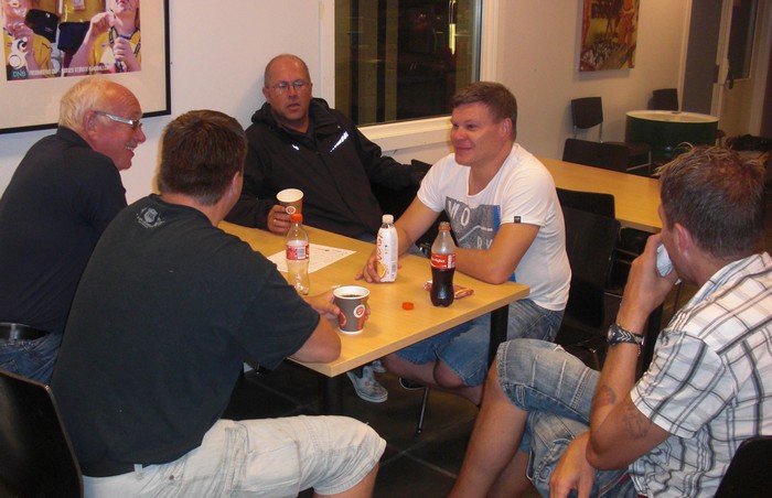 I kantina møter jeg en gjenge som sitter og venter på sluttspillet i par.