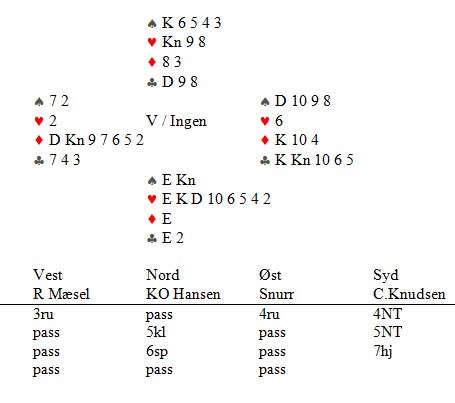 Bare noen få hadde stoppet under slem og bare et par i 7 kl doblet som aldri står med kl J1097 i Ø. 2 par i 7 NT, ett av dem doblet, gikk 1-2 beter og av de som spilte 6 NT av S fikk bare 4 spillere 13 stikk.