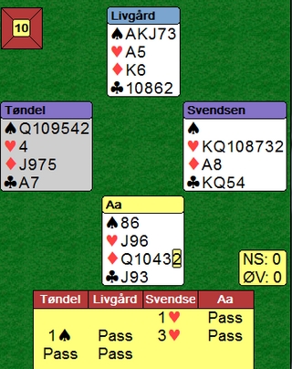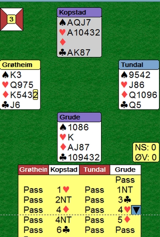 Her mot Egil Meyer (V)- Eivind Ruud (Ø) hadde Jan Martinsen i N sp J5- hj 62- ru A- kl AKDJ9632, men over 5 kløver som et par andre par fikk doblet med bare -500 ut meldte ØV videre til 5 hjerter som står for 650. -2!