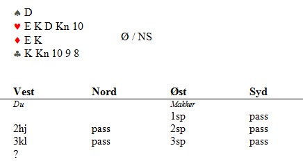 Du har sp KD10875- hj 4- ru DJ3- kl A107 og over åpning 1 NT fra motparten melder du 2 hjerter og passer svar 2 spar fra makker. Er du ennå sterkere mht honørstyrke kan løft til 3 spar være invitt til utgang.