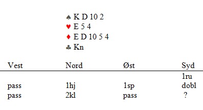 Jeg hoppet til 3hj og mente med det at jeg hadde gitt et greit bilde av hånda mi, en ubalansert hånd med trekort hjerter og omtrent 15-17hp. Det stemmer jo fint, men problemet er at pasienten var allerede død når vi hadde kommet for høyt. Makker hadde xx,xxxx,Kxx,Kxxx.