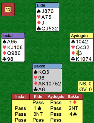 Christian Bakke gjør en god (og heldig) vurdering når han tar ut 3NT i 4sp. 3NT er steindødt med hjerter ut og det skjer ved det andre bordet. Hvordan spiller du 4sp med ruter fire i utspill?