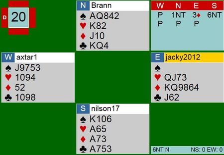 Mot 6NT kom det ruterkongen ut og i slike spill er det oblagatorisk å telle seg fram til et stikk mindre enn det en må ha. I dette tilfelle er det derfor rett å la ruterkongen beholde stikket for å ordne rett tempo til en mulig skvis. Øst skifta til hjerter i stikk to (uvesentlig)