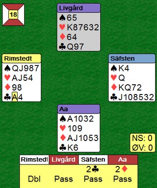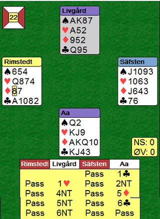 Han valgte å oppvurdere denne fine 14-poengeren til 15-17 og kom med det i utgang. Jeg vet ikke om den kan beites med åpne kort, men ruter ut til damen gjorde spillet ikke så vanskelig. Spar i stikk to og da var det 1-2-4-2 = 9 stikk. Jeg vet ikke hva du synes om Nils sin gjenåpning i ugunstig sone. Terje gjorde nok det beste ut av situasjonen ved å passe og etter et ikke helt topp motspill ble det hele ti stikk og + 480 ut for minus 2 IMP. En blå lapp av syd og helvete hadde vært laus. Litt mye parturnering, unge Kvangraven? 17-5 til Sverige