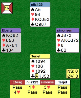 Godt meldt av Berg - Simonsen, men det ble en beit. Jeg vet ikke hva som er beste spilleplan etter EK i kløver ut, men den Erik valgte gikk i alle fall skeis. Han stjal tredje kløveren, ruter ess og ruter til stjeling. Så EK i hjerter og når Terje Lie stjal med sparkongen, ble det beit. Spar til esset etter ruterstjelingen, og så hjerter hadde gitt +620, men det er ikke sikkert det er en bedre plan.