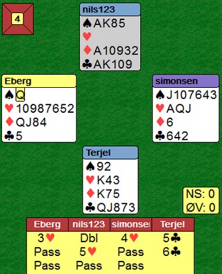Nils passer over 5kl med EK i en farge og makker har åpnet, uten at jeg helt skjønner hvorfor . Han ble reddet av gong-gongen.