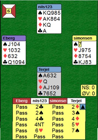 Så en flott storeslem av Berg - Simonsen. 4kl viser renons og EK der var kanskje ikke det beste, men det er jo aldri noen ulempe med esser og konger, så fremt hånda ellers også er sterk. Erik stjal to to små kløverne i bordet og kasta to spar på EK i ruter. 13 stikk.