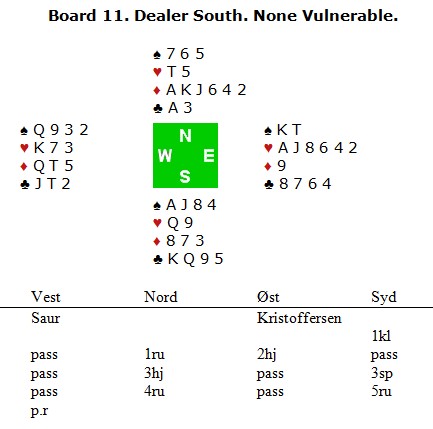 var et spennende spill. Begge parene kom i 3NT, men 6kl er en fin kontrakt. I praksis vil en nok gå beit fordi en prøver først hjerter mot esset (for å kaste en ruter i vest). Når det ikke går, spiller en tre ganger spar og kaster ruter i bordet for så å stjele en ruter for det tolvte stikket. Syd har bare dobbel spar, går heller ikke den planen. Det går an å vinne 6kl, men det er nesten double dummy. (en eller to ganger kløver før en spiller spar, kanskje ikke umulig?)