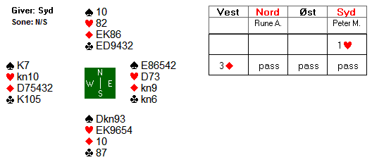 I Torsnes BK ble det jevnt om pallplassene. Ragnar Helgesen og jeg ble overkjørt av Tommy Lødding og Christoffer Heldahl og dermed var vi forvist til 2. plass bak T&C. I vårt 2. spill der vi satt Nord- Syd med alle i faresonen åpnet jeg (N) med 1 ruter, Tommy meldte innpå 2 kløver og Ragnar (S) meldte 2 ruter. Da Christoffer bidro med 3 kløver gikk det to ganger pass men Syd fightet med 3 ruter. Deretter pass rundt.