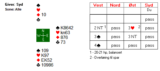 Vi ser at det er kritisk for forsvaret å etablere et kløverstikk før spillefører kommer inn og får satt opp et avkast i hjerter.
