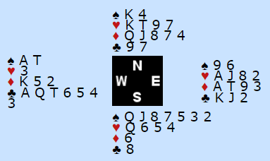 En som ikke har vært mye blind i denne turneringen så langt er min lagkamerat og debutant, 20 år gamle Matt Brown. Etter en litt trøblete start for han og makkeren Michael Whibley (29) har de storspilt både i de siste kvalik-kampene og i kvartfinalen - så langt. Her var Matt Brown i 6 kløver etter at nord hadde gått inn med 1 ruter og syd hadde vist sparfarge.