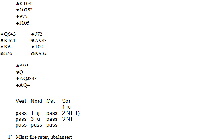 Ingen andre kopierte denne kontrakten hverken i dameklassen eller i åpen klasse. De aller fleste spilte lilleslem i hjerter, mens en håndfull ulykksalige prøvde seg i 7 hjerter, og enda noen flere stoppet i utgang.»