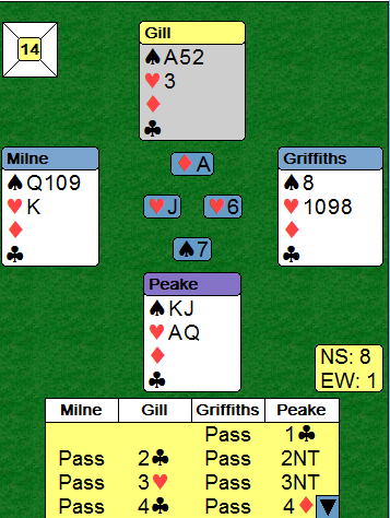 Et av Australias beste par, Sartaj Hans-Tony Nunn (Sartaj er skribent i BIN) var på laget som tapte Trials-finalen. De fant ikke ut av det og stoppet svakt i 4 grand. Ved det andre bordet fant heller ikke N/S toppkontrakten 6 kløver, men Andrew Peake og Peter Gill meldte 6 ruter med førstnevnte (syd) som spillefører. Han fikk trumf ut fra vest og lot den seile til østs konge, og det kom mer trumf. Da var det elleve toppstikk. Kontrakten ser ut til å avhenge av å velge hvilken finesse som skal tas, spar eller hjerter. I ruterkontrakt kan en hjerter trumfes tidlig for å se om kongen sitter dobbel, så falle tilbake på sparfinesse. Alternativt kan det tas A-K i spar for å se om damen sitter dobbel, så prøve hjerterfinessen. Ingen av de variantene lykkes. Peake spilte imidlertid på en sjanse for skvis, og han kunne i så fall prøve hjerterfinesse som siste sjanse. Han tok en tredje runde trumf, så fire runder kløver. Deretter tok han de to siste ruterne, og idet den siste ble spilt så det slik ut: