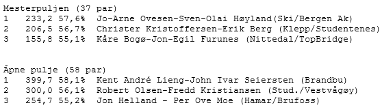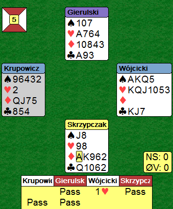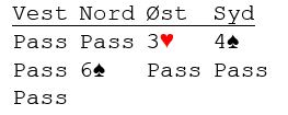 Ved det andre bordet åpnet øst med 2 kløver, krav til utgang, og da var Ø/V sikret mot å stoppe i delkontrakt. Men paret hadde kanskje ikke gode nok avtaler for de videre meldingene, og øst fikk ikke tak i at vest som jo måtte melde faktisk hadde elendige kort. Dermed gjorde øst et overmodig slemforsøk og endte i 5 hjerter! Som sagt så kan det se ut som elleve stikk kan vinnes; fem sparstikk, fem hjerterstikk og ett i kløver om det gjettes riktig i den fargen. Men det ble aldri noe kløvervalg. Syd spilte ut ruter ess som øst måtte trumfe. Nord kom inn på hjerter ess og spilte nok en ruter som øst igjen måtte trumfe. Da han tok ut trumfen og det viste seg at nord hadde fire trumf ble spillefører fri for trumf selv. Han kunne forsyne seg med fem sparstikk, men da det var to kort igjen satt nord med kløver ess og en ruter, og forsvaret tok de to siste. Et litt merkelig tapsspill for 2 kløveråpneren; kontraten 1 hjerter ved det ene bordet og 5 hjerter med bet ved det andre.
