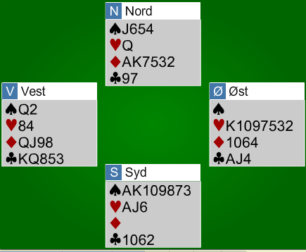 Oooops, tenkte sikkert øst da det raskt gikk pass rundt på hans 1 hjerter. Som du ser er både 4 spar og 4 hjerter enkle utganger å vinne. Det står faktisk enkelt i 5 spar, og det kan se ut som om det er elleve stikk i hjerterkontrakt også.