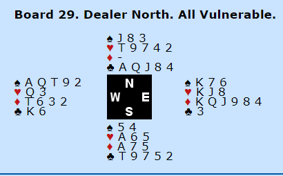 Ved vårt bord valgte Jon å serve hjerter, og dermed fikk Johansen billig stikk ved å stikke min knekt med damen. Kløver til knekten gikk som smurt og esset ble også tatt. Så trumf til damen vant også og sp A ble tatt. Kløver 10 fikk løpe og min sp D vant, men ruter kunne Rune stjele og nok en kløver til K og røff ga stikk for sp A. Ruter kunne nå bare slippes og Jon fikk vårt 3. stikk for esset. 10 stikk, 420 ga dem +10. Heldig med utspillet og 3-4 finesser gikk bra.