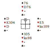 Løsningen er å satse på trumfen 3-2, da går det greit ved å ta to store spar. Så kjøres i gang med kløverfargen. Hvis vest trumfer må han spille hjerter som løser den fargen med kun to tapere, eller ruter til dobbeltrenons som gir stjeling på den ene siden og hjerteravkast fra den andre. La oss si vest ser det og nekter å trumfe. Den femte kløveren gir da avkast for en hjerter fra nord, men bare en. Dette blir igjen: