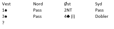 Videre har man en direkte melding fra vest over syds dobling. Kontrollmelding, ja, men sier det noe om «kløverproblemet»?