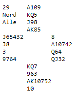 Omtrent en fjerdedel av feltet meldte slem. En spillefører gikk bet, de andre vant den. Resten spilte stort sett 3 grand med elleve stikk som ga -2,2 poeng. Han ene som var i 5 ruter fikk -13,4 poeng selv om han fant ruteren.
