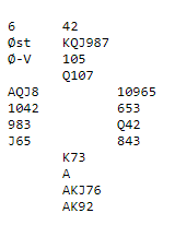 Det var endel slemmer og "nesten-slemmer" mot slutten av lagturneringen. Her er et spill hvor syd hadde en god, men en litt ekkel hånd å melde (Giver øst, Ø/V i sonen):