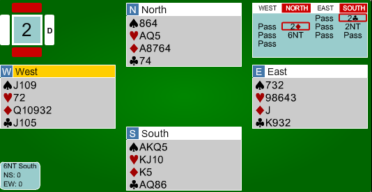 Som vi ser er 6 ruter en meget god kontrakt, som i praksis står så lenge trumfen løser seg uten taper.