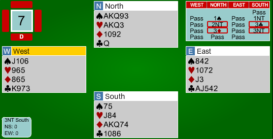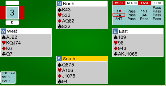 I neste spill fikk vi se et klassisk eksempel på at lilleslem i minor av og til kan være en bedre kontrakt enn 3 grand: