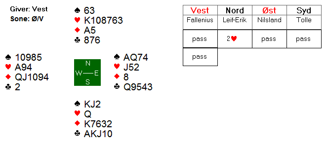 Øst spilte ut sin single ruter, som Leif-Erik stakk med kongen og spilte hjerter. Vest stakk med esset og så at det ikke var noen hast med å gi makker ruterstjeling, men skiftet i stedet til sin singelton i kløver.