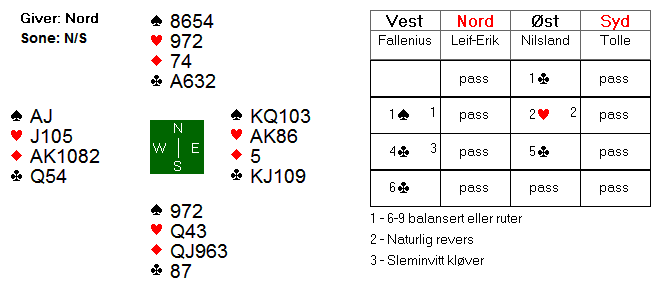 Leif-Erik vant stikket med kløver 10, men var låst i bordet og prøvde en ruter til esset. Øst stjal og fortsatt med kløver dame til stjeling i vest.