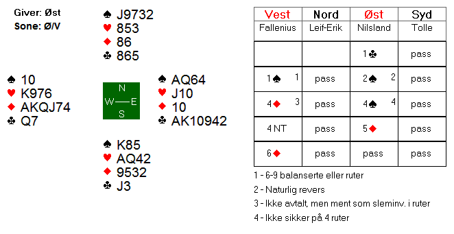 Jeg tror ikke svenskene hadde helt kontroll på meldingsforløpet, men etter at øst valgte å reversere på sine 14 gode poeng, stod vest på til 6 ruter.