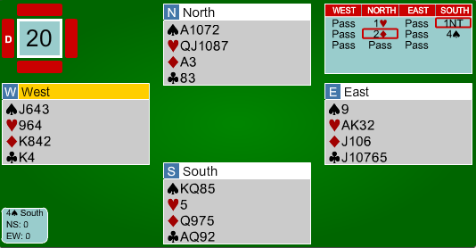 Vest får 1. stikk, Øst legger styrke og Vest spiller ny spar til makkers ess. Nå skifter Øst til trumf og du må velge hvilken dame i minor du må finne for å unngå 4 tapere- eller er det andre muligheter?