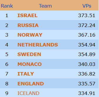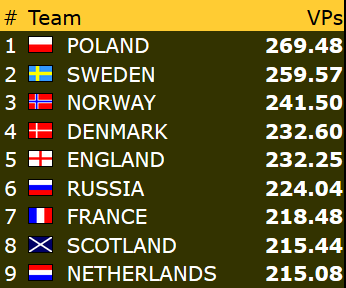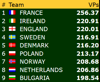 Onsdag kveld er registrert og bare 3 dager med spilling gjenstår før alt av ære, VM- kvalik m.m. er avklart. Så langt er Norge i tetskiktet i både åpen (4. plass), damer (3. plass) og Veteran (3. plass) og det er meget gode forhåpninger om å bli blant de 8 beste som går til VM- spill senere i år.