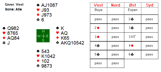 Espen åpnet med 2 kl og gjenmeldte 3kl som utgangskrav med kløver. Over 3NT sleminviterte Boye med 4 kløver. Han har riktignok bare 1 kløver, men den kan være virksom, og han har i tillegg mye honnørpoeng. Espen løftet til slutt 5kl til 6kl med kontroller i begge major.