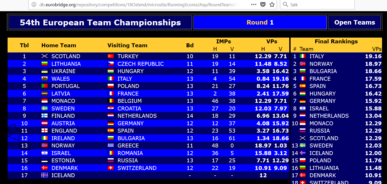 Ved det andre bordet hadde grekeren åpnet med 1kl på Espen sine kort, og da kom de bare i 3NT og dermed 12 IMP til Norge.