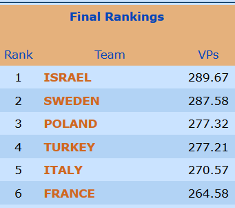 Jeg må innrømme at jeg ikke er like kjent med alle navnene, men har sett at Sverige, Italia og Frankrike stiller sterke lag. Israel er regjerende mester, og Polen pleier alltid å være sterke, så de vil nok sammen med Norge og et par andre nasjoner være medaljekandidater. Siden jeg har kommet med tips både i dame- og åpen klasse, får jeg tippe veteranene på den litt sure 4. plassen. Det betyr ikke at jeg ikke har troen på medalje, men det får bli en bonus, så får jeg heller tåle litt "kjeft" fra Roald for at jeg ikke har tippet oss høyere...